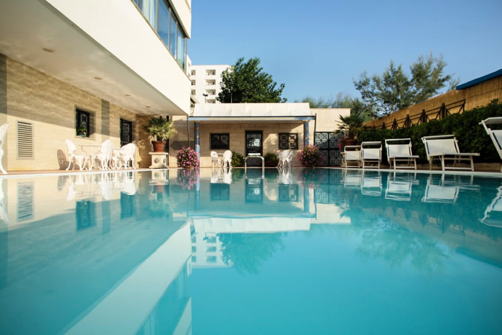 Das Hotel bietet einen herrlichen Pool mit Blick auf den Strand, wo Sonnenschirme und Liegen eine Oase der kühlen Ruhe bilden.