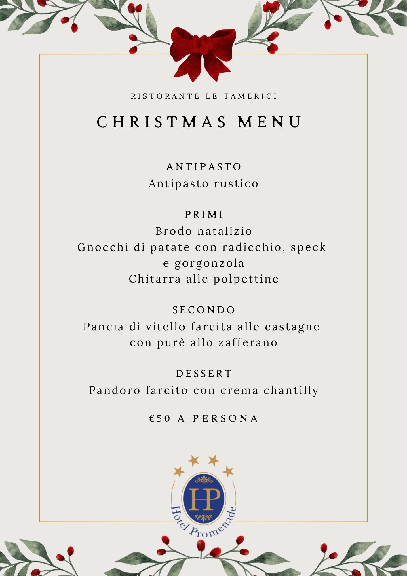 All’Hotel Promenade di Montesilvano ti attende un’esperienza unica: il Pranzo di Natale nella straordinaria sala panoramica del Ristorante Le Tamerici, dove ogni sguardo si perde nell’azzurro e ogni sapore diventa ricordo.